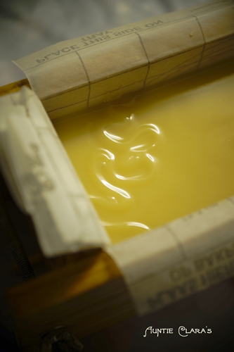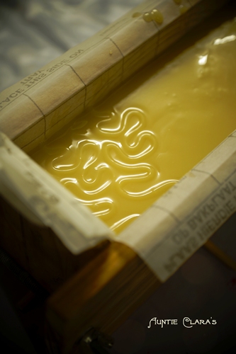 You pour the soap at very light trace. In fact, you should pour as soon as your emulsion is stable. This is often the case well before trace. The benefit of pouring before trace is that you’ll be able to scrape out your bowl or pot into the mould without leaving any drip marks on the surface. Drip marks on the surface may seem slight when the soap is wet but tend to look a lot more accentuated once the soap has set.
