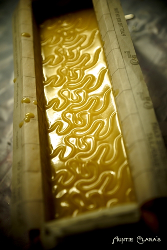 I mostly work with log moulds, but the inverted stamp technique works well with slab moulds and individual moulds too. The larger the surface area the more you can show off the embossed designs eg by using several different embossing tools to create intricate combined designs. Note, however, that a large surface might take longer to emboss so make sure that you work with soap formula and fragrance that doesn’t thicken too fast.