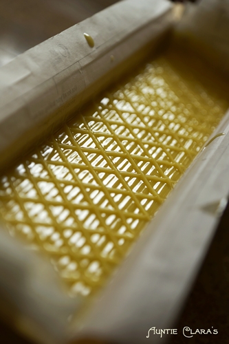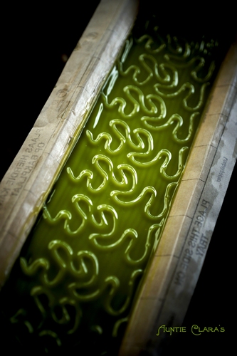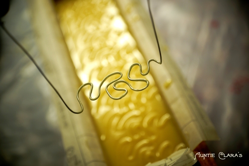 The inverted stamp technique of embossing soap can obviously be used for an endless number of designs depending on how skilled and artistic you are at bending wire – either on its own or in combination with other design techniques. One of the most popular designs using this technique is the lattice top with crossing diagonal lines making a wafer-like pattern on the top of soap. In the picture below you can see that the soap batter was already slightly too viscous when I made my lines. The ridges are of uneven height due to jagged peaks forming as the thickening soap begins to stick to the wire.