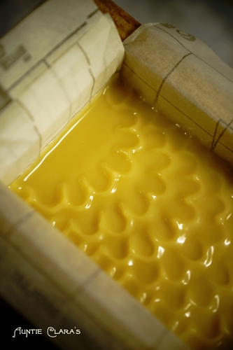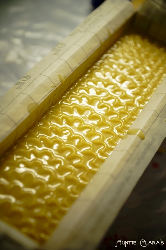 - I first pull my comb/onion chopping guide along the surface of the soap making drag marks parallel to the long sides of the mould.