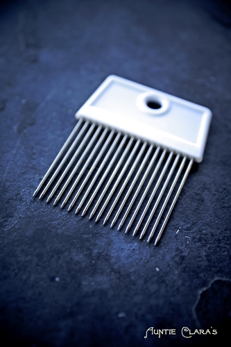 Once the soap is in the mould you check the surface. If you managed to pour at emulsion you’re likely to be fine and can proceed to the next step. If you poured at trace and you have drip marks on the surface you’ll want to smooth them out. You can do it with a spatula, scraper or something else that produces a flat surface. Or, you can add a bit of extra texture with something that produces drag marks. For lattice tops I like to use this guide for chopping onions, but eg an Ashanti comb or afro pick could serve the same purpose:
