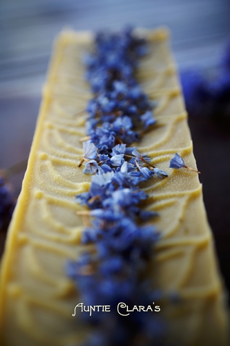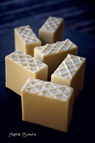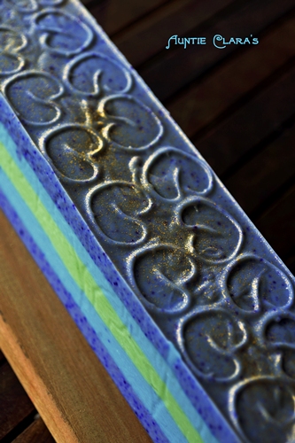 The inverted stamp technique is a method of embossing the surface of soap. When embossing soap with a stamp you force an imprint into the soap. With the inverted stamp technique you do the opposite: you ‘pull out’ a mark on the surface of the soap – hence the name. I make no claim to have invented the technique; it’s been around as long as cold process soap has been made. But I have worked extensively with it and made it a defining design feature on several of the soaps in my standard line. It’s practical because it allows you to add interest and decor to soap tops while essentially keeping them flat for easy packaging.