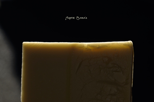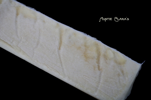 Now back to the mysterious yellow line running the length of the log right where I pulled out the plastic divider. How can that be explained? A few days after the soap was made the line is not as bright as it was on cutting, but it’s still clearly visible. DOS (dreaded orange spots), a visual indication of rancid oils in the soap, spring to most soapmakers’ minds when dealing with unaccounted for yellow colour. But DOS rarely shows up immediately and the spots seldom have well-defined edges like my yellow line does. Considering that the entire log was made with the same well-blended oils it’s unlikely that the centre line alone would show signs of rancidity. Looking at the surface of the log, however, does give some interesting clues: