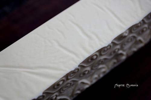 From the inverted stamp pattern on top you can tell that the marks were made at about medium trace on both the low-water and high-water soaps. Before making these marks I smoothed out the entire top surface with a scraper. Now, if you look at the bar in the centre you can see that the surface of the low-water soap is smooth between the ridges. The high-water side, on the other hand, is ‘knobbly’ or ‘wrinkly’ like orange peel – or a severe case of cellulite. So, yellow blotches on the side and a knobbly, uneven top. Off the top of my head I’d say that looks like overheating issues. Having seen these clues I’m thinking that the yellow line in the centre of the soap is also a sign of overheating. While the low-water soap was going through gel phase it would have reached a temperature way above the gelling temp of the high-water soap. Seeing that the high-water soap overheated on the side that was closest to the 60C ambient temp it’s possible that it was scorched too on the side that was right next to the much hotter, gelling low-water soap.