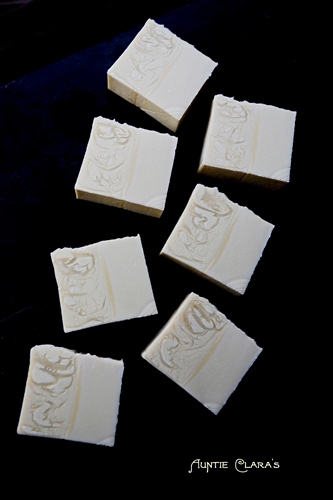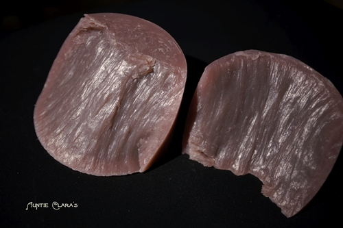 The two pieces in front are low-water soap. The split wasn’t quite as neat as for my carnation soap above but it does reveal some interesting texture.