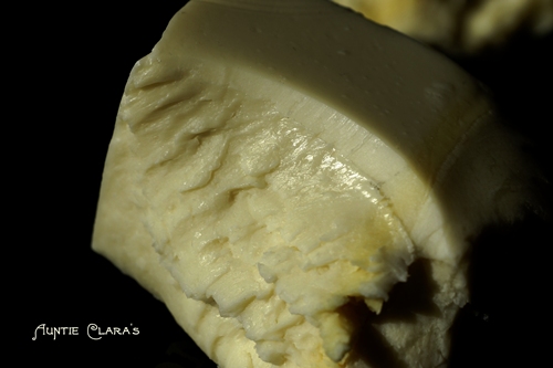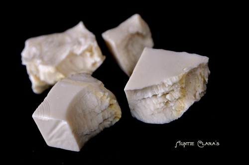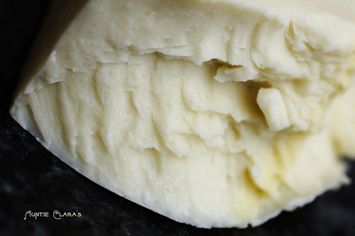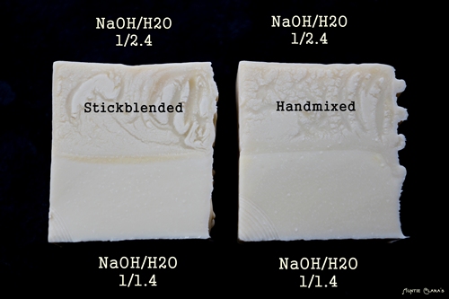 A. The low-water soap didn’t go through gel phase, ie it didn’t crystallize. That’s a pretty radical thought given that the soap was saponifying, ie generating heat by itself in addition to spending 4h in an ambient temp of 60C. Also, it spent that time rubbing shoulders with its high-water friend who evidently did go through full gel, yet the low-water soap shows no signs of what is known as ‘partial gel’. In partial gel some parts of the soap go through gel phase while others don’t due to uneven heat distribution. Visually, this tends to manifest itself as ‘crop circles’; darker areas where the soap has crystallized and lighter areas where it hasn’t. But, I never saw the low-water soap gelling; I put my experiment in the oven and went grocery shopping – I must remind myself not to multi-task next time I’m conducting important scientific experiments . When I took a first peek, the soap was well into its third hour in the oven and the high-water soap was gelling; dark in colour and soft to the touch, but the low-water soap looked like it does now and was firm to the touch. Since we know that low-water soaps go through gel phase at a higher temperature than high-water soaps it’s not entirely impossible that my ambient 60C wasn’t enough to force the low-water soap to gel so I’m not discarding this alternative.