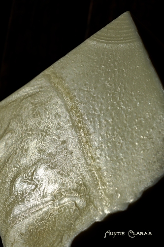 When you cut soap, you cut through the crystalline structure and you’re not likely to get a good view of this internal structure. When you put pressure on the soap and it splits, it’s likely to split along the grain and if you’re lucky you might get to see a split as neat as this. Here you can clearly see the sunlight reflected in the grain of the fibrous crystalline structure giving it a silken sheen.