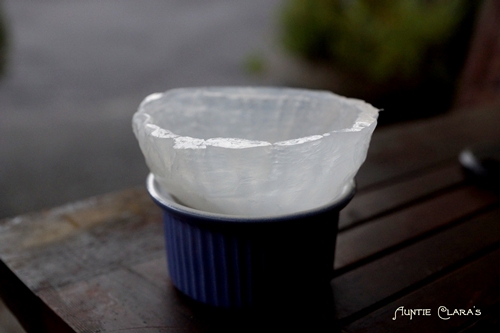 Since this is an el cheapo mould I used a minimum amount of silicone and I didn’t use any extra to build a base for the mould to stand on when in use. Instead I rest it in a suitably sized ramequin for stability and easy handling. The ramequins can be moved around, put in the oven etc. You could also use a tea-cup or a sturdy mug for this.