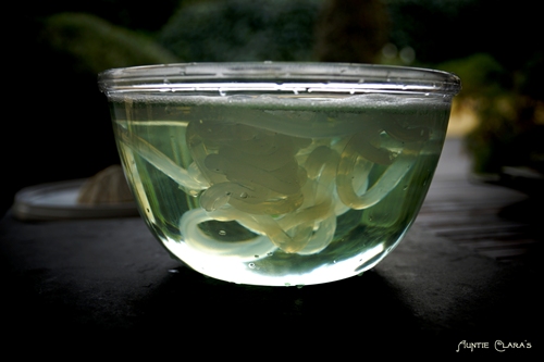 Caulking silicone is very sticky, but anybody who’s used silicone to seal things in a bathroom or kitchen knows that you can use dishwashing liquid and water to prevent it from sticking to your hands while you’re working with it. So, I filled a big bowl with water and a generous helping of dishwashing liquid. With my trusty old caulking gun I emptied the silicone into the water.