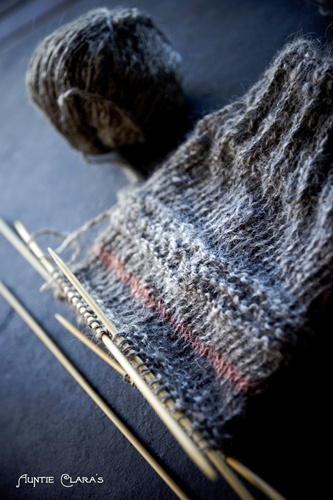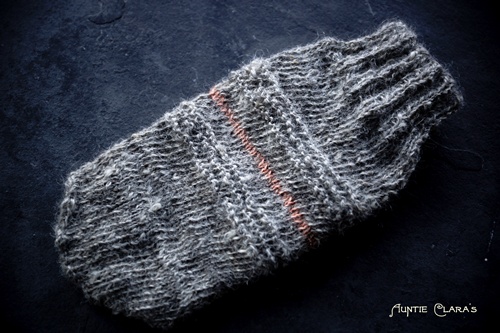 I was busy with other projects on my loom and so knitting was the order of the day. Thin needles would produce the firmness I wanted in the fabric and with use the mitt would felt enough not to stretch too much when wet.