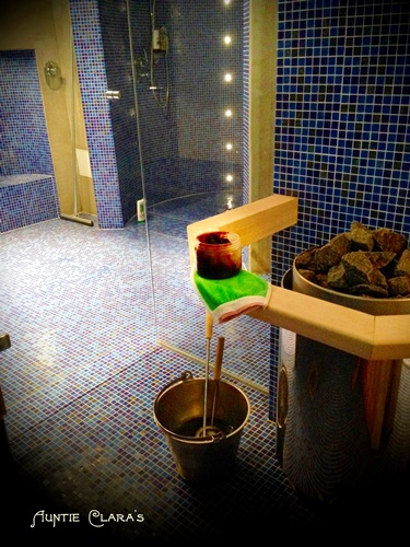 The particular sauna that we had the privilege of bathing in on that night is one of the most beautiful saunas I know. Very modern with tiny cobalt and ultramarine blue tiles, some with a golden shimmer, covering floors and walls all beautifully lit with tiny LED lights.