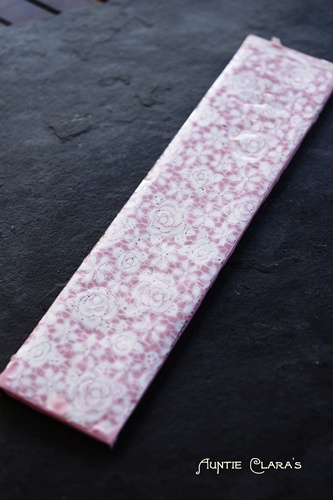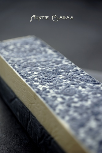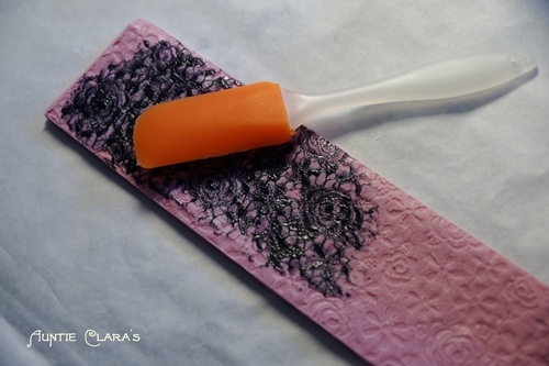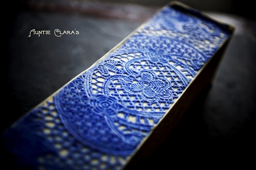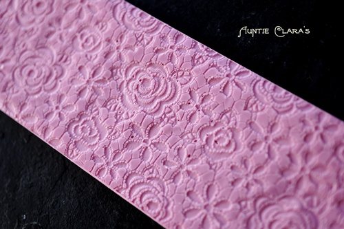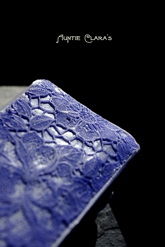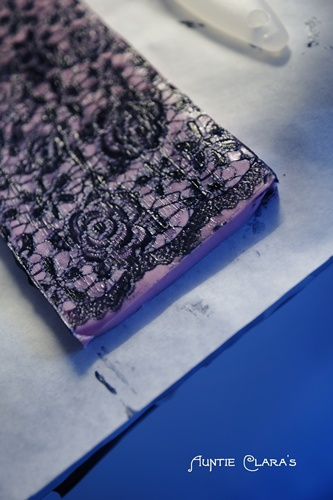 I said earlier that plastic doilies and many fondant mats have positive relief and leave a negative imprint on the soap. Now I wanted to transfer the positive image of the lace onto the surface of the soap and add a contrasting colour to set off the lace and make the detail more visible. For that I needed to make a silicone texture mat with concave grooves using the lace as a negative.