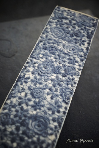 So, sticking the back of the lace to something really sticky was the order of the day and I used a couple of strips of really sticky packaging tape for this. You could use sticky labels or whatever you have handy that prevents the silicone from ending up underneath the lace. If you’re making a mat for a mould that is larger than the size that your lace comes in, this is the time to combine several pieces of lace arranging them nicely and sticking them all to the same backing.