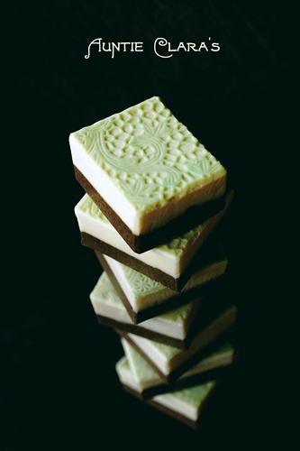 Vanilla Mint. The pale mint green is pretty and because the grooves in these mats are fairly deep it works although the colour contrast is not very strong. Here, the texture mats with the green soap were oven processed a day before the white soap was poured on top. Smells fantastic by the way! 🙂