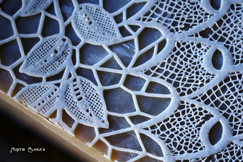 Thank you everybody for all the kind comments! It was a lovely project to plan and do and a nice challenge because this particular piece of lace was so very fine. The glue applicator thingy that I did the crenellated line with is a scraper with one edge that has exactly that crenellated profile (for spreading ridges of glue with spaces inbetween). You pull the edge of the applicator through the surface of soap at heavy trace to get the texture and then you pour soap of a different colour at very light trace on top.
