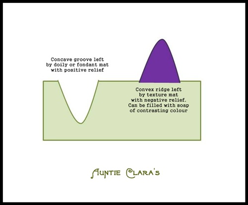 What many regular silicone fondant mats and plastic doilies have in common is that they have positive relief and make a negative imprint on the soap, i.e. the pattern that you see consists of concave grooves in the soap, mirroring the positive relief on the mat or doily.