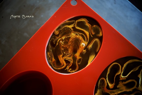 On the surface of the soap which was still at light trace I dropped a mixture of oil and gold mica. By blowing on the mica oil drops I managed to move the mica across the surface of the soap, creating rings. The first bar was clearly a bit of a practise specimen (although I think there is some interesting marbling potential there).