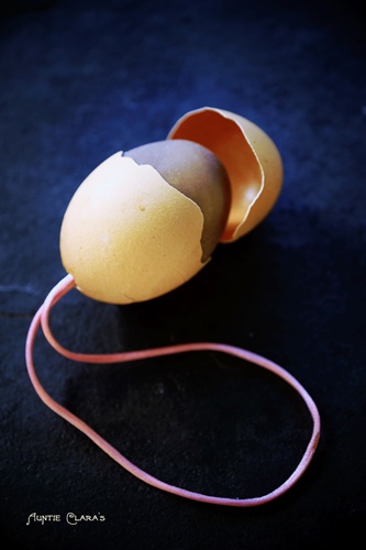 I placed the eggs in the freezer for a few hours to help the shells release. Just like I would with a proper chocolate Mignon egg, I tapped the back of a small knife along the ’equator’ of the eggshell and for the most part the shells peeled off quite easily. In some spots they stuck tight, but with a little bit of water I managed to ’rinse’ them off.