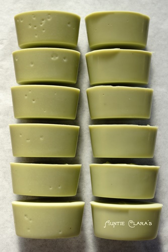 60C or 140F is lower than the 170F or 77C often suggested for cpop (cold process oven process), but my proofing oven keeps that temperature and I find it very useful for keeping soap nicely warm during saponification. Using my normal paper lined wooden log moulds and a low water formula I can keep soap at that temp for a few hours by which time the soap has passed its heat peak and doesn’t zap anymore. When using individual silicone moulds I usually avoid keeping the heat on for extended periods of time, but here I wanted to study the effect of doing just that.
