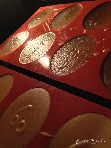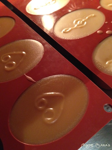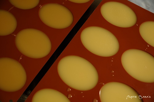 For my new experiment with heat, I chose my trusty oval silicone friand moulds. Saponification is an exothermic reaction, i e it generates heat. Soap is a good heat insulator and so the heat generated through saponification builds up inside the body of soap until it eventually finds its way out of the soap. The smaller the body of soap, the easier it is for the internally generated heat to escape. Likewise the distribution of volume in the body of soap (i e the amount of surface area per volume) will affect how quickly heat will be able to escape. 1kg of soap in a cube-shaped block mould will keep heat trapped inside for a long time, but 1kg of soap spread in a thin layer over a large area will cool down much faster.