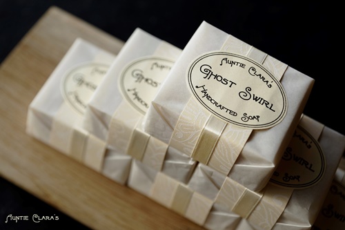 For those keen to be part of the action and follow the further developments of the original Ghost Swirl Soap first hand, a few bars of this first-ever batch are available on our webshop as of today – beautifully wrapped in suitably ghostly attire with hand-printed trim 🙂
