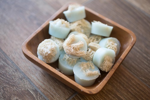 Another blue soap with an exotic name is the Bombay Blue soap which came about after I saw a picture of a soap made by Charlene Simon of Bathhouse Soapery and Caldarium in Hot Springs, Arkansas. Charlene’s soap was a small round, moulded soap with a piece of loofah embedded on top. The soap was beautifully photographed in soft light that brought out all the beauty in the combination of delicate, translucent blue soap and natural, cream-coloured loofah.
