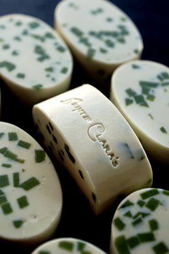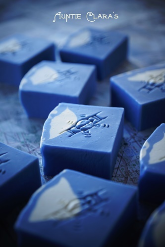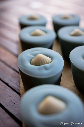 I had been working on developing an oval blue brine soap with an Indian Ocean theme (I can see the ocean from my window), but I hadn’t come up with a final look that I was happy with. Charlene’s little blue soaps sparked an idea and so the Bombay Blue with its little cream coloured sea shell embed on top was born. The name was inspired by the blue gin, Bombay Sapphire, and the soap was given a fresh scent with plenty of juniper berry to match the notion of gin.