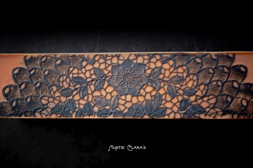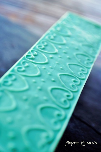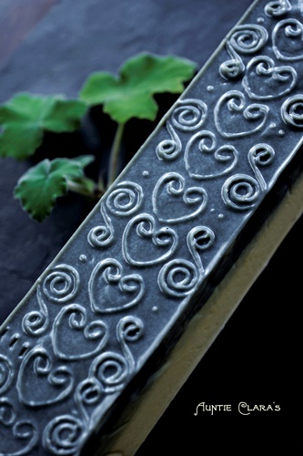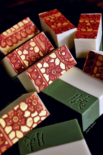 The two-tone texture trim that I now make on several of my soaps was first inspired by a picture I saw of a striking pink and black layered soap log with what looked like a sprayed-on white lace pattern along the bottom/top and sides. That gorgeous soap was made by FinchBerry Soapery. I still don’t know how they make their lace pattern – possibly using a stencil – but I was very inspired by the idea of a see-through pattern in a contrasting colour on the soap. I held on to that idea and did several experiments. Just a doily or a normal impression mat gave a negative imprint without the possibility of using contrasting colours and creating a positive 3D effect. So, I decided to turn the doily on it’s head, as it were, and use it to create a texture mat with a rich and finely detailed relief unlike any impression mat I had seen. It worked beyond expectation and I have since combined this technique with the mica priming technique that I first saw introduced on some very elegant soaps by Lori Curry of Magellan’s Gift, creating a combined effect which is rather striking.