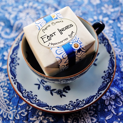 One of the soaps that I make with a textured lace trim is the East Indies soap. The white soap with its blue trim takes after the flow blue Melbourne china service that was passed on to me by one of my grandmothers.