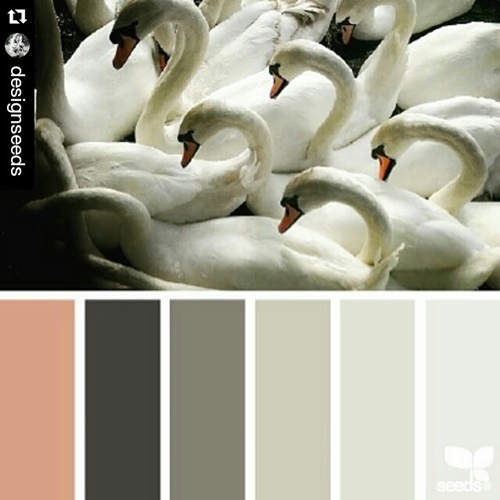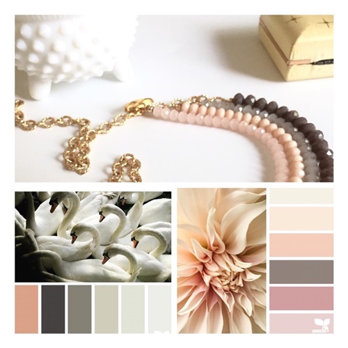 I took this picture of the beautifully posing swans in rich, reflected river light while on holiday in July and posted it on Instagram. Jessica Colaluca of Design Seeds was inspired by it and made a beautiful colour palette from the picture. Jessica’s colour palettes, in turn, served as inspiration for jewellery maker Rachel Rotabi’s (@vintagerehabjewelery) delicate bead necklace: