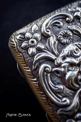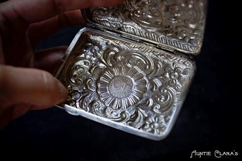 It was a repoussé and chase work cigarette case, complete with a spring hinge in perfect working condition and little rings inside to attach bands for keeping the cigarettes in place. It was solid silver, undamaged – and beautifully made.