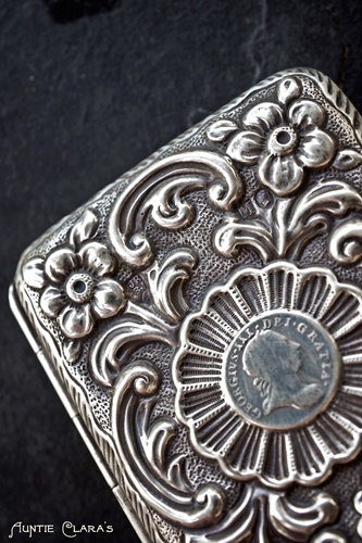 A box like this one seems very exclusive today, but in the day when it was made, large quantities of silver items like this were made in various towns in England. I think there probably was a special story to this box initially; a special commission for a particular occasion perhaps. But we’ll never know; there are no personalized engravings on the box. The coin is another mystery. At 125 years it was quite an old coin at the time, but what was the significance of incorporating it in the box? Was it a special lucky coin that whoever commissioned the box specifically asked to have embedded in the box? Again, we’ll never know..