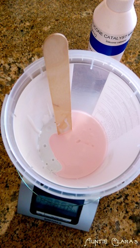 Next up I needed to mix my silicone. As I said earlier silicone is expensive and you don’t want to waste any, so it’s a good idea to mix as little as you think you will need and then mix more later if necessary. For this project I guesstimated that 150g of silicone would be just about enough and it turned out to be the perfect amount. Too lazy to fetch my proper soapmaking scale from the soap room I used my little battery scale in the kitchen and boy is it annoying to have that gadget turn itself off mid project! Anyway, I did manage to weigh first the silicone and then the catalyst. The silicone needs to be mixed thoroughly; when you think you’re done you go on mixing for a good while. Once thoroughly mixed I poured the silicone onto my silver case in my cardboard box.