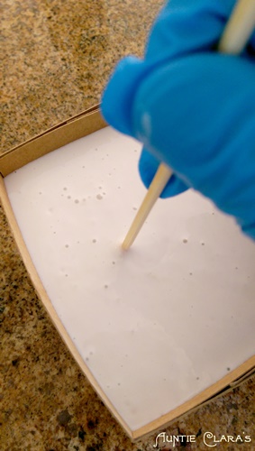 Once I had poured all the silicone into the cardboard box I used a skewer to release air bubbles from all those little bumps and grooves on the surface of the silver box. A soap mould I would routinely tap against the worktop to release bubbles, but here I definitely didn’t want to dislodge the silver negative from its position inside the cardboard box so no tapping or banging this time.
