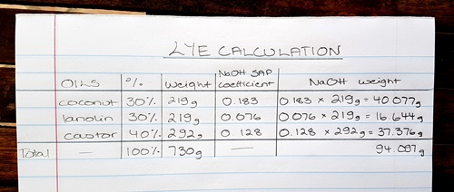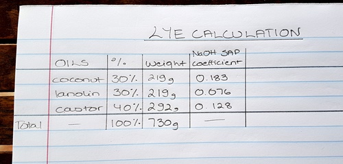 Now that we know how this works, let’s try another recipe. Again, I recommend that you don’t try to make this recipe at home; it’s only formulated to illustrate lye calculation – not to make great soap.