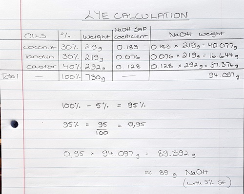 To make this recipe with a 5% superfat I need 89 grams of sodium hydroxide.