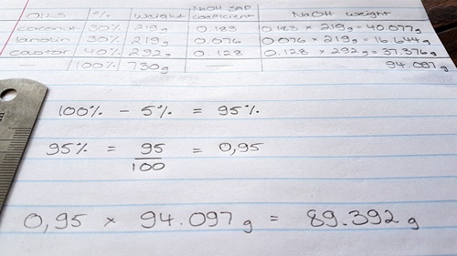 In our recipe we want to allow for a 5% superfat. A 5% superfat means a 5% lye discount, i.e. we will use 100% – 5% = 95% of our lye.